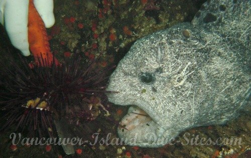 On a trip there we encountered the above hungry Wolf Eel who readily ate the sea urchin that was offered.